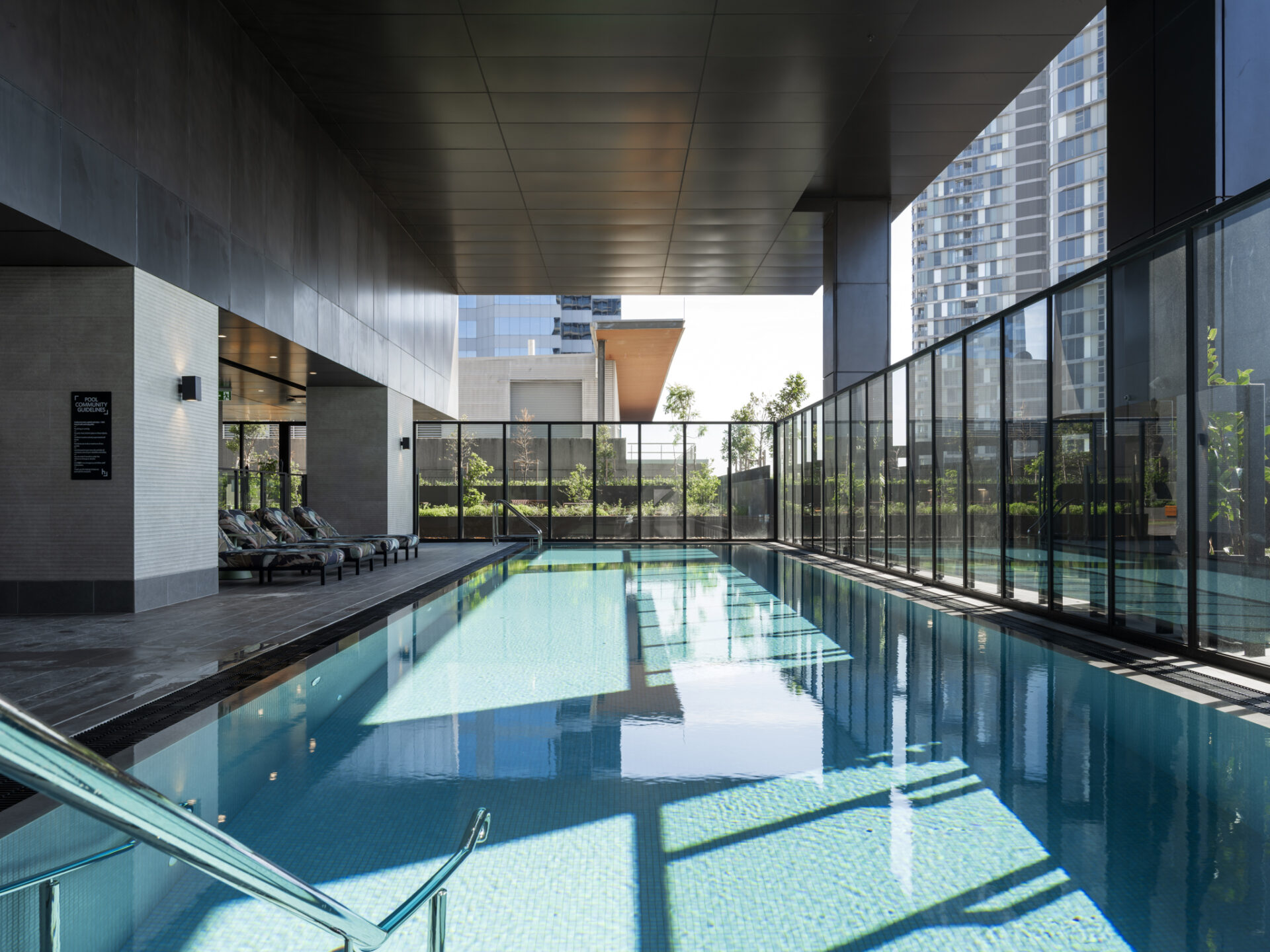 Communal areas offer residents the perfect place to relax during the day, or just enjoy some fresh air and dinner after work in the evening. The well thought out amenity and common spaces throughout the building are designed to actively promote a strong sense of place and community that is more connected and social – there’s an indoor spa, pool and gym, a large landscaped lawn with a projection screen for movie nights, and even a ‘sky pets’ park for the resident dogs to play.